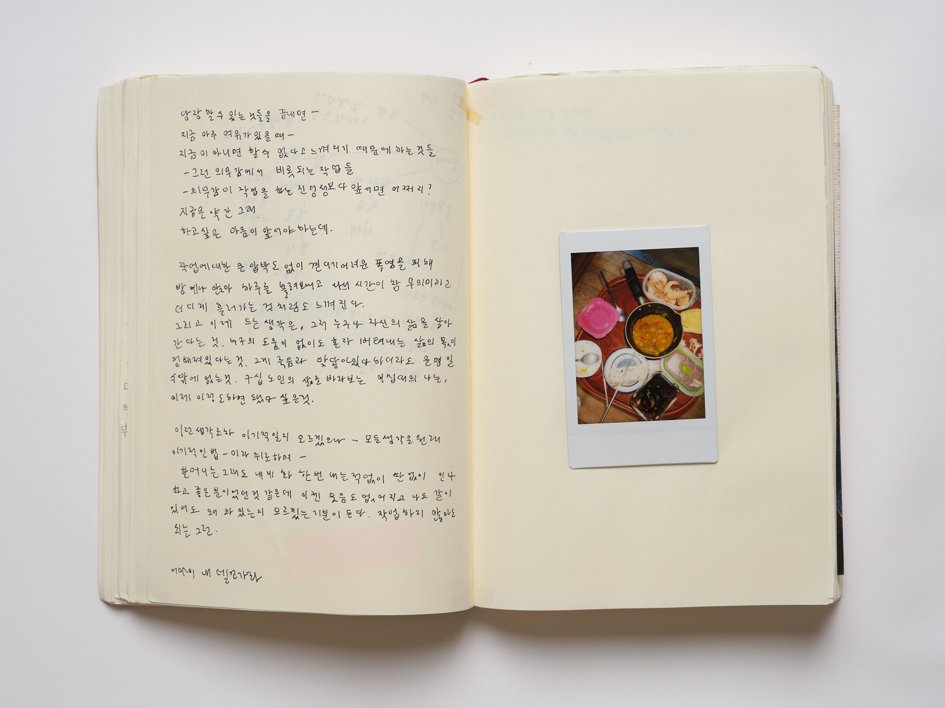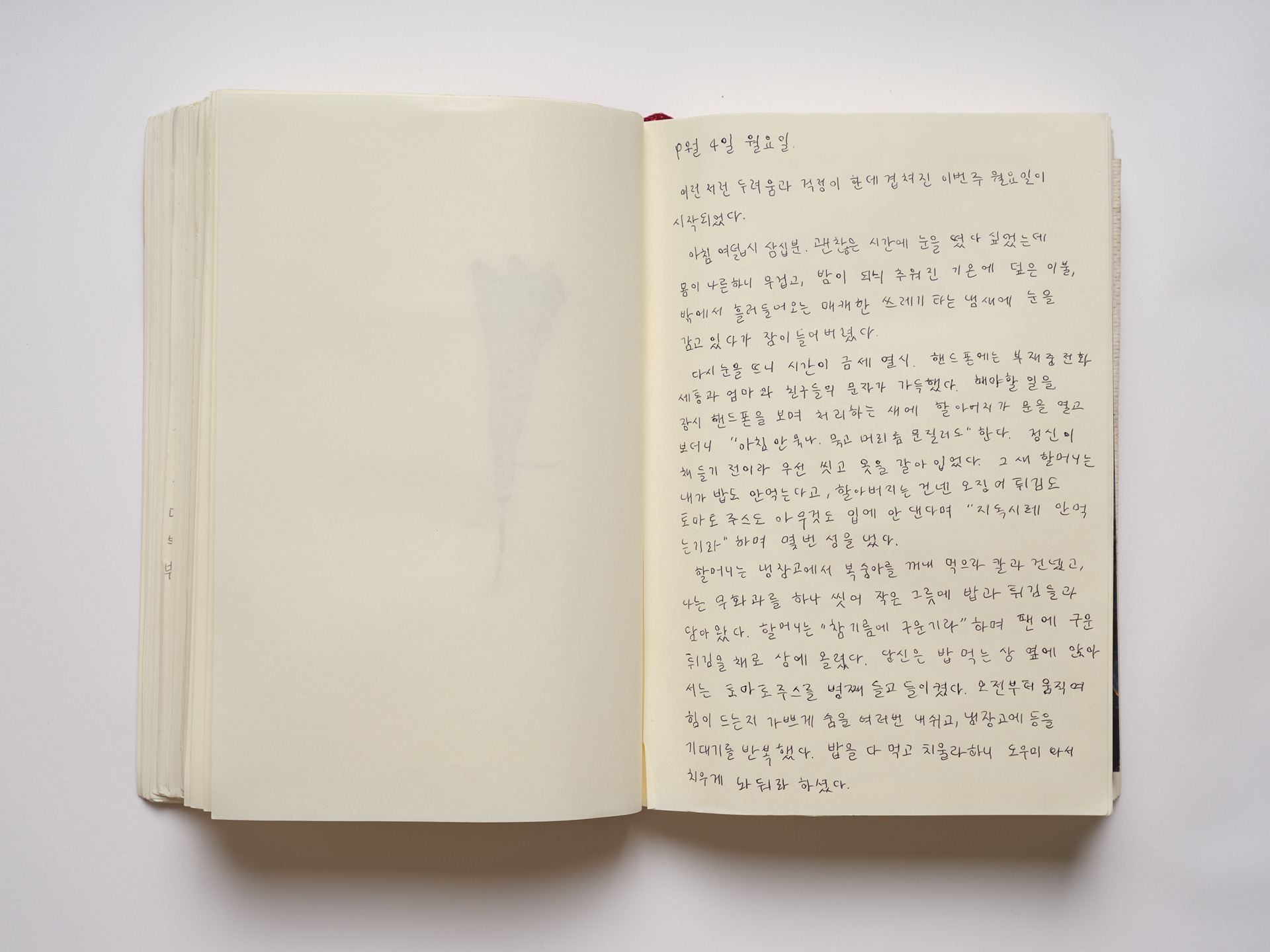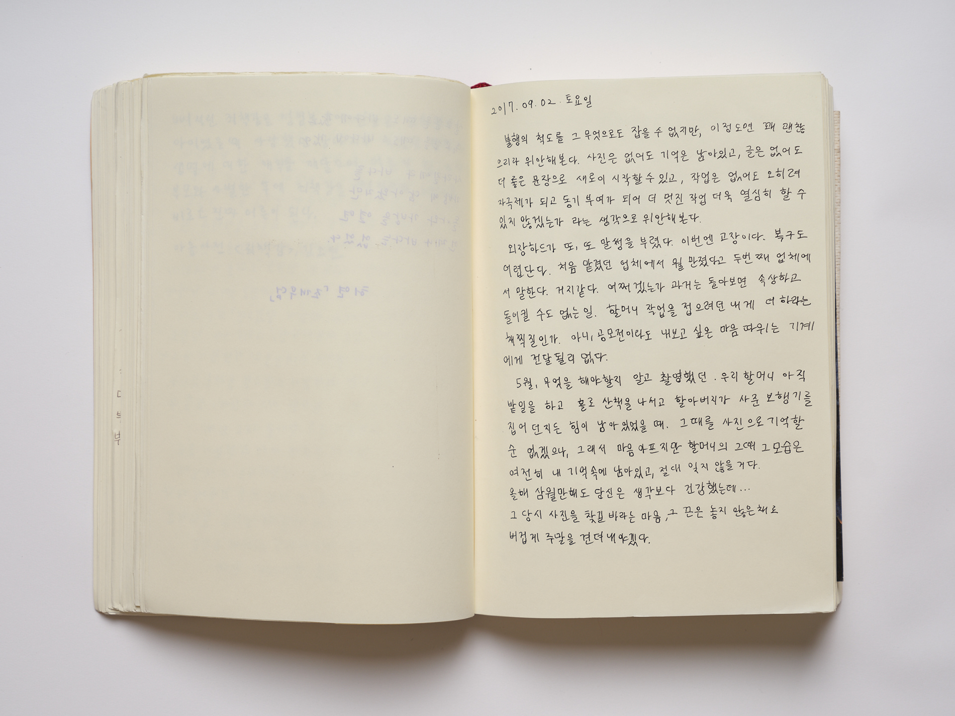 2019년 12월 할머니가 돌아가신 뒤 촬영을 마무리했다. 이 작업은 나와 할머니가 주고받은 지난 마음들을 이해해 보려는 모종의 노력이다. 할머니의 손길과 나의 시선이 만나고, 서로의 감정이 마주 보며, 과거와 현재가 맞닿았던 순간들이다.